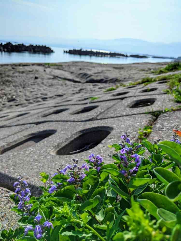 淡く遠くに山、キラキラの海、テトラポット、砂浜、海岸で見かけた青い花💙