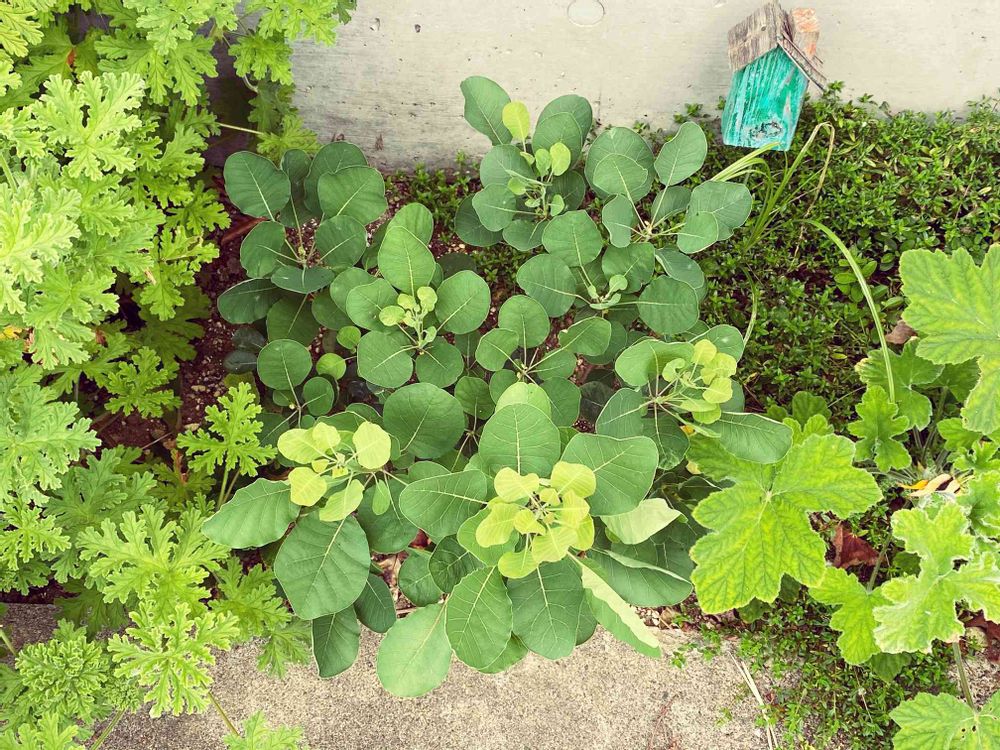 スモークツリーの葉がとてもきれい。ローズゼラニウムとペパーミントゼラニウムの間に植えました。ゆっくりと大きくなってほしいなー。