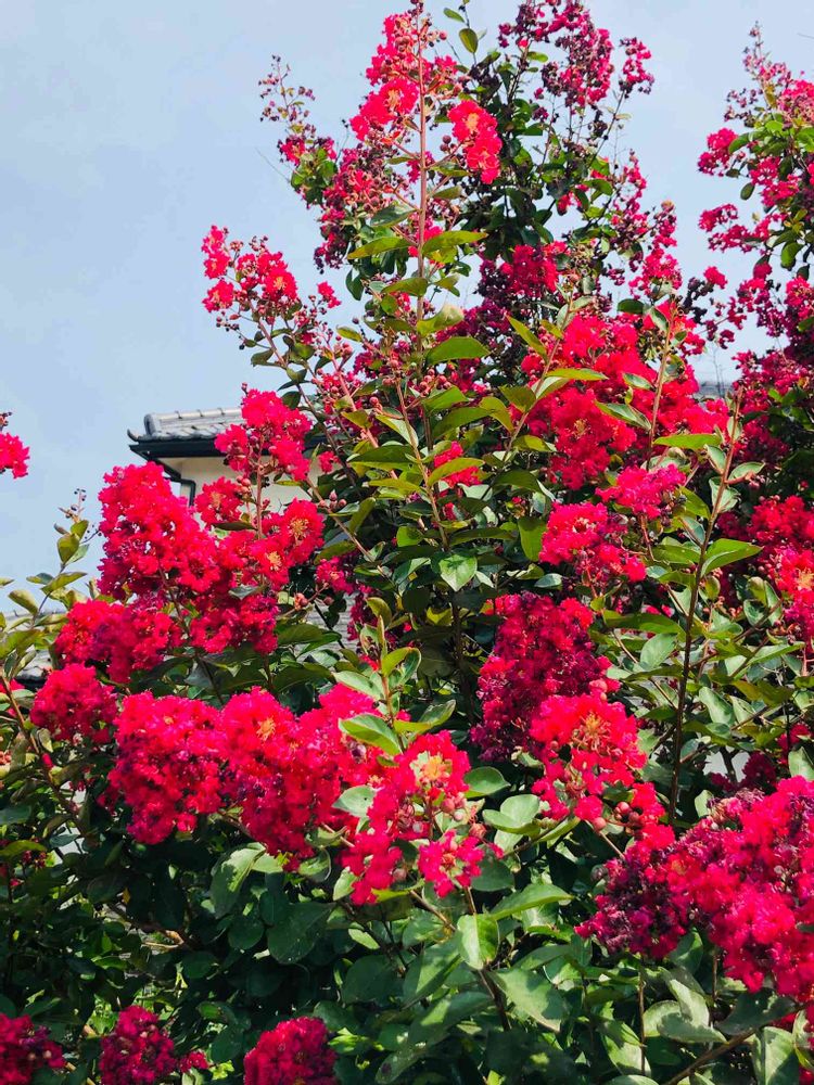 仕事の帰り道にある邸宅の庭のサルスベリの花が真っ赤に開花していました。今日は朝から夏らしい暑さで30度超えらしいです。