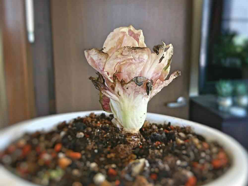 結球部分は黒くただれた葉が乾いてパリパリに貼り付き、中身が腐っているかどうか確認できなかったので、、、思いきって枯れ葉を全て取り除いてみました。「もう手遅れかもしれない」そこで大胆に固く閉じた結球まで無理やり開いて確認しました。芯は腐れていませんでした。しかし、私はその時点でやっとトレビスが全く育たずにドンドン弱っていく原因を見つけることに成功しました。
