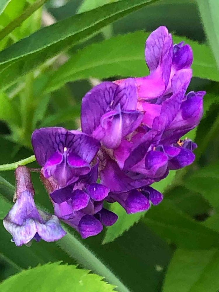 戦場ヶ原を横断する、国道120号線沿いの林の中の草むらで、紫色のラッパ状の小さな花🌸を沢山まとめて茎の先に咲かせているのは、たぶん「ナンテンハギ」の花と思われます❣️