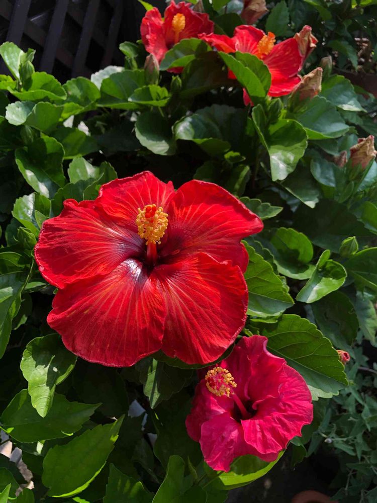 二種類の花が並んで咲いてますが小さなピンクは普通の大きさなんですが、上の朱赤のハイビが大きくて…😄🌺
