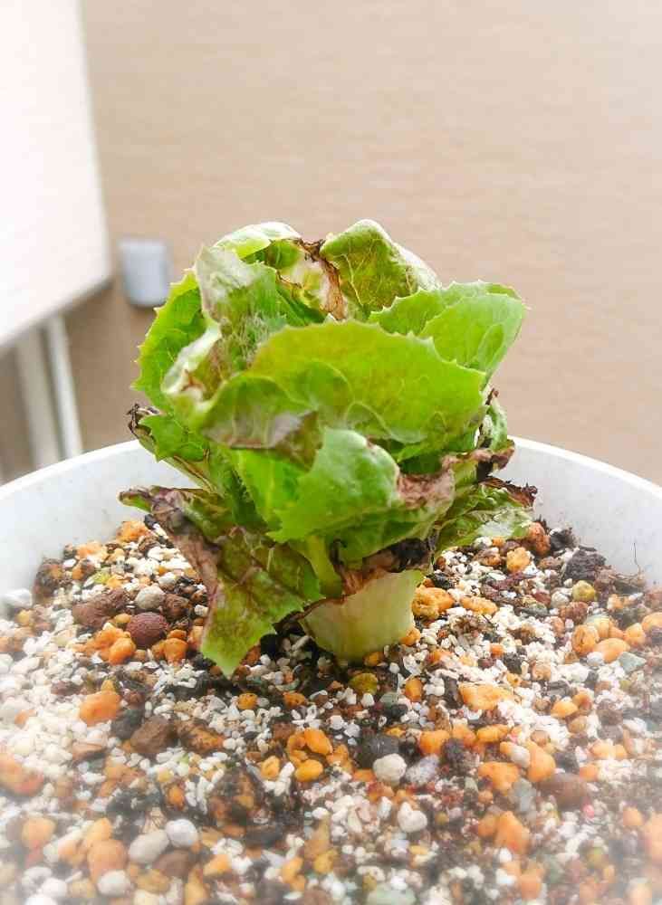 しかし結球の中身までは確認しておりませんでした。葉を無理やり開くわけにはいきませんし、一見おかしな感じがなく日にちが経ちました。が、苗は1つの新葉も出さずに少しずつおかしくなっていきました。植え替え直後は養生として室内で育てておりましたので、大きな害虫は入ってこれません。