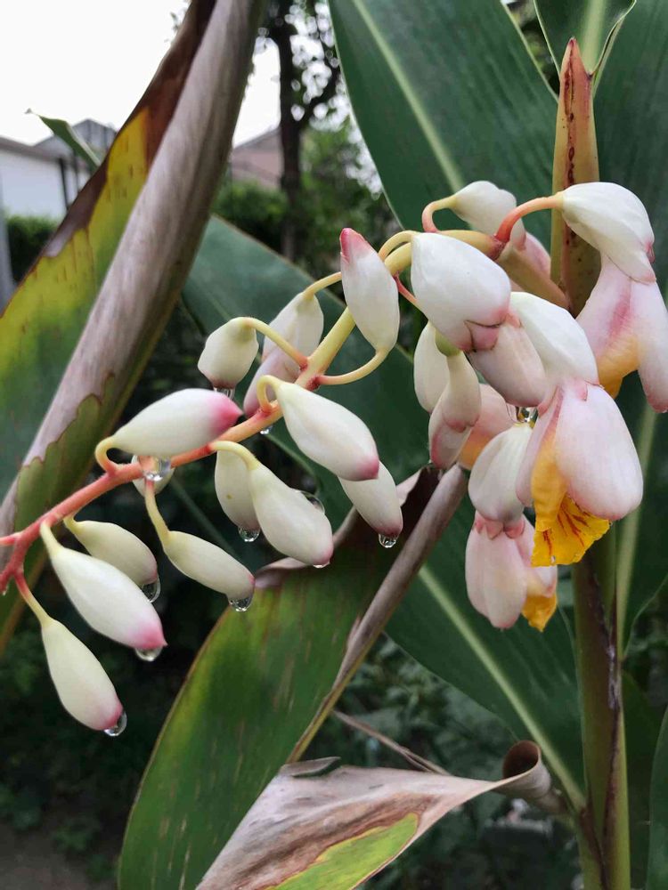 月桃の花が咲きました (庭) 朝 雨は降らなかったけれど花に水滴がつきました。