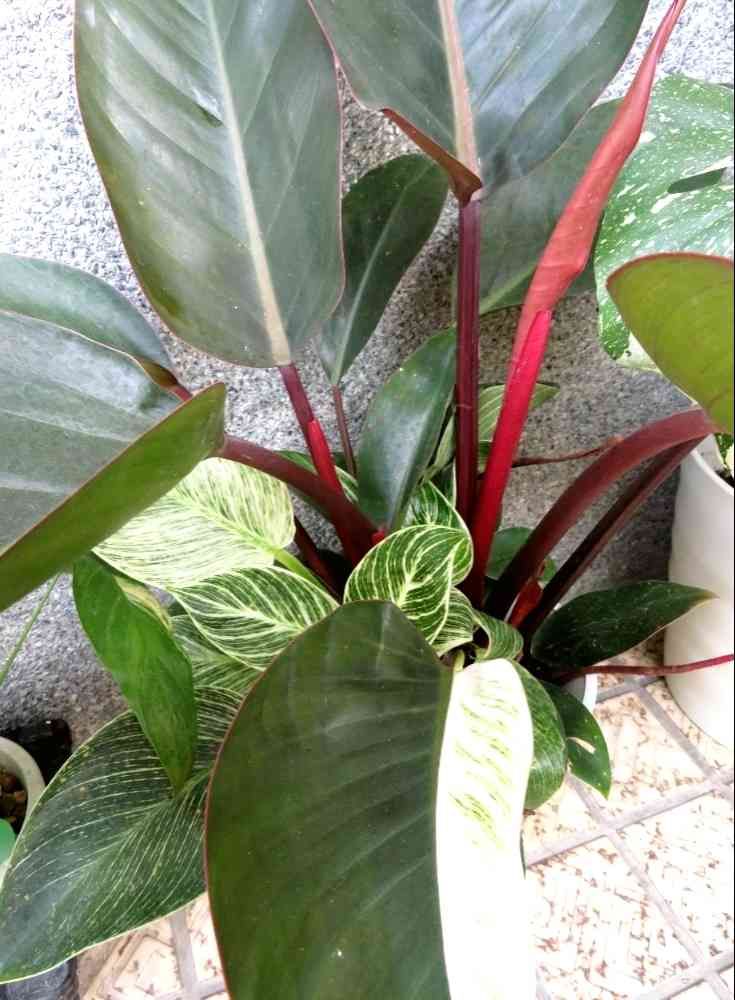 こんばんは。大きいのはインペリアルレッドかロジョコンゴで、シマシマはバーキン。稀にハーフムーン出るようですがレアですよ。下の緑のはバーキンの古い葉か、インペリアルグリーン、キャニフォリウムだと思いますよ。フィロデンドロンは根っこをよくはるので暴れたら手に負えないので、分けられるうちに分けたほうがいいですよ。この子らはもともと寄せ植えには向かないです笑笑