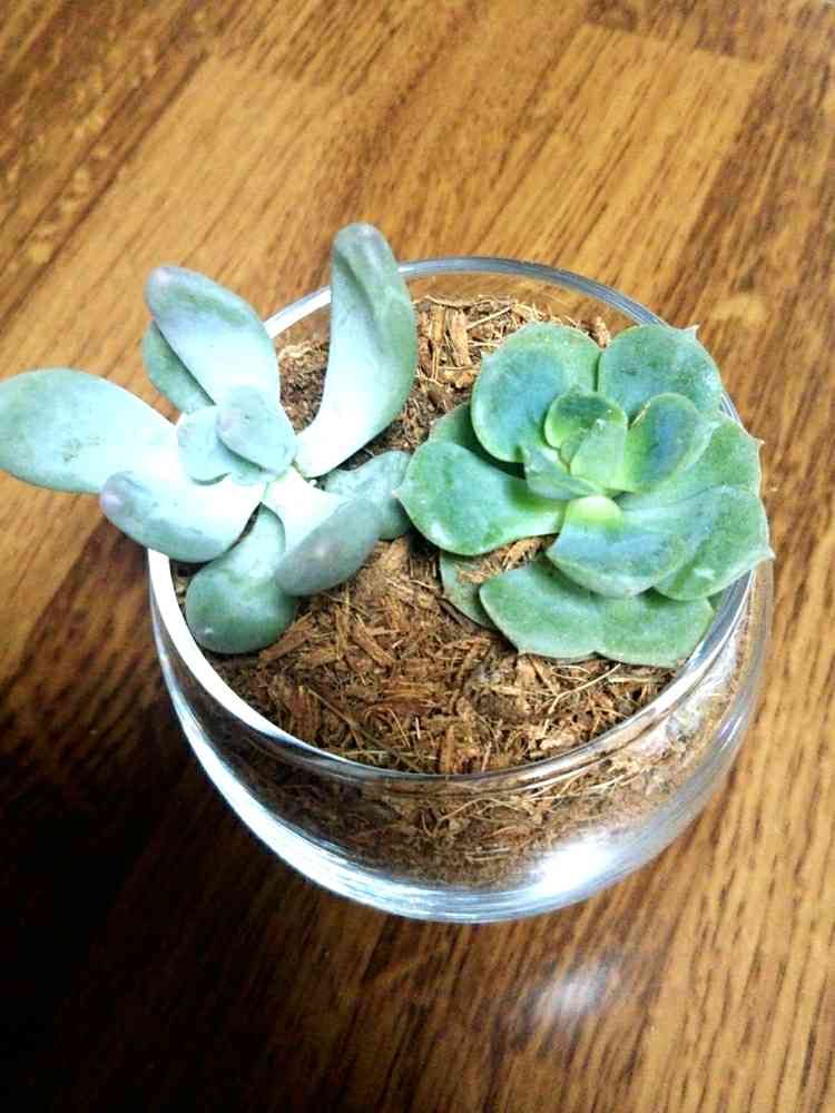器はケーキ屋さんのプリンかな?入ってた物を貰ったのでそれに合う多肉植物をと思って探しました!