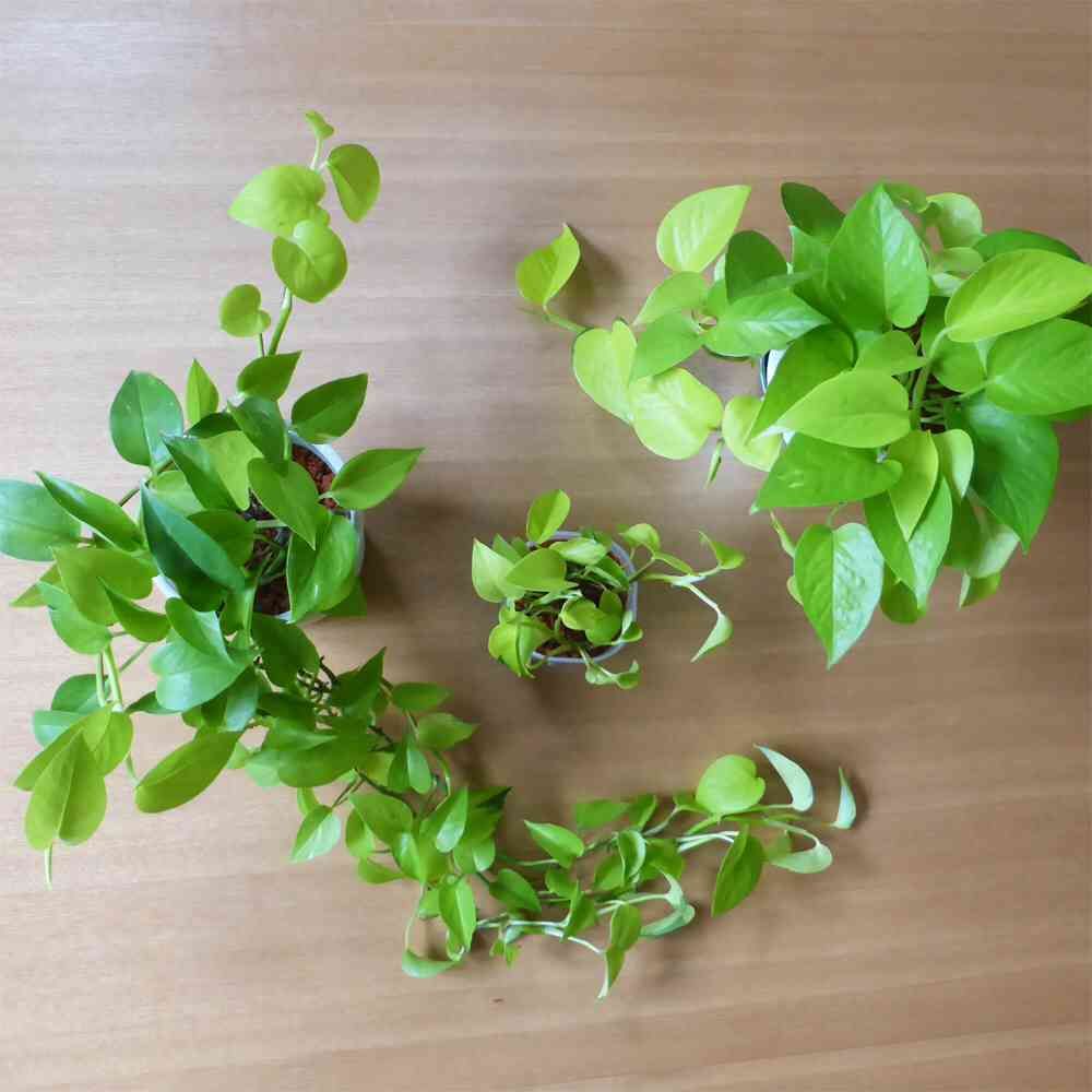 左のポトスライムコンパクト、今春出てきた葉っぱは軒並み大きくて茎は太い。セラミス用液肥を再開したからかなあ?