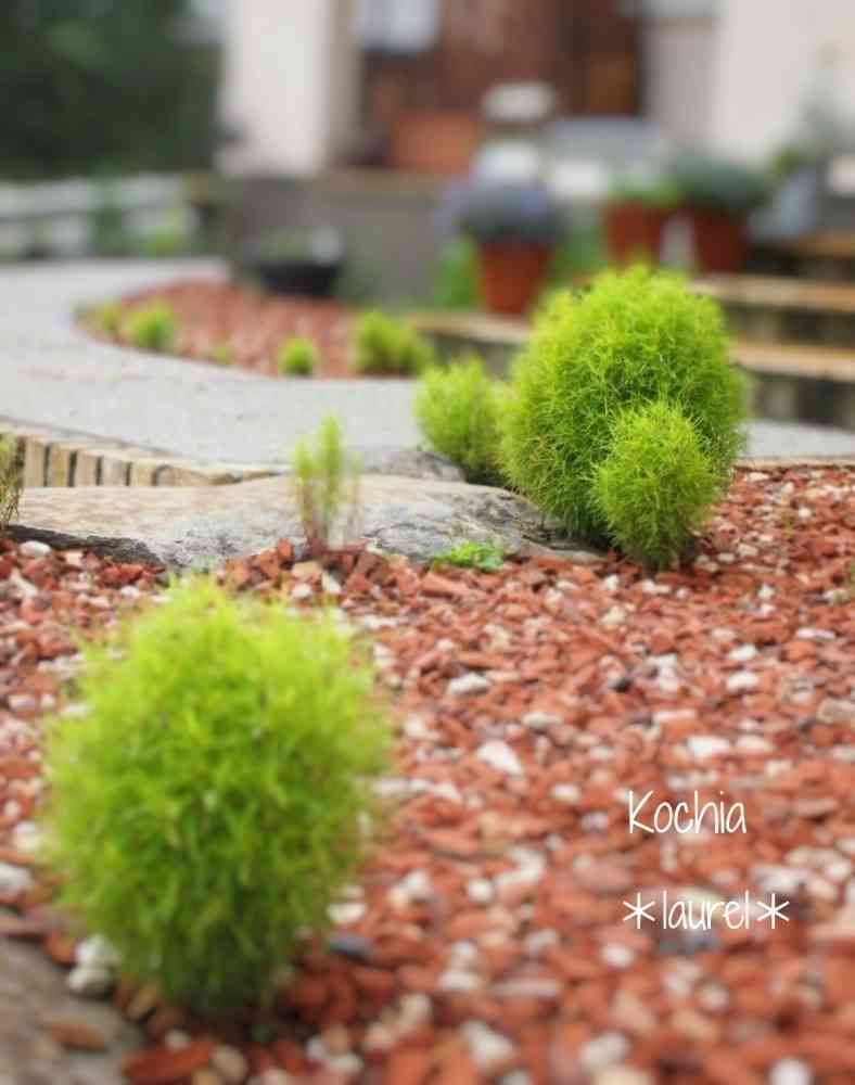 GSによると、コキアは砂利混じりの痩せ地がいいそうで、うちのここなんか防草シートの上にレンガチップが乗っている所なのよ