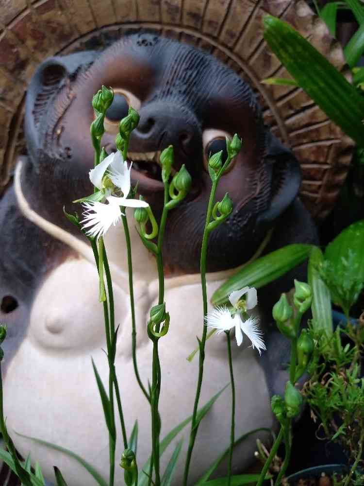 我が家の古いタヌキさんとサギソウのコラボでちょっと涼しい…かも🤭🤭🤭