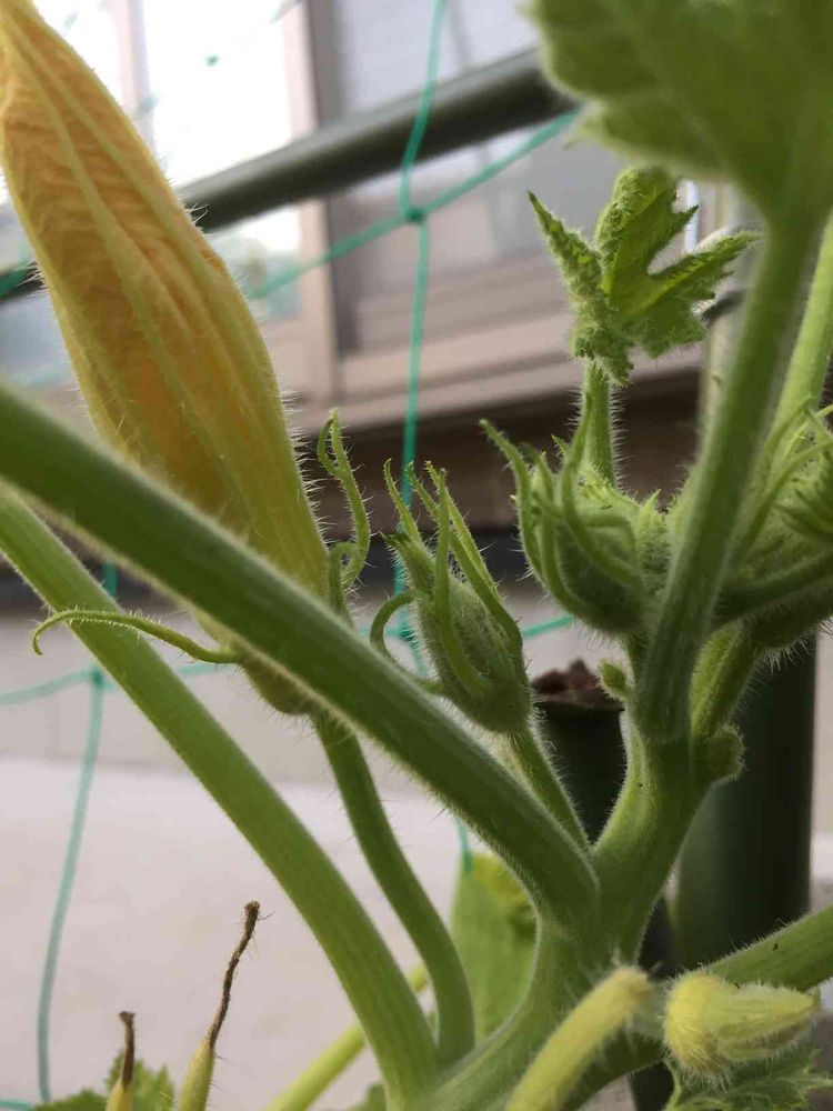 ひとつ 小さな雌花を見つけました。 蕾の雄花は 今朝 ぱっと開いていました。