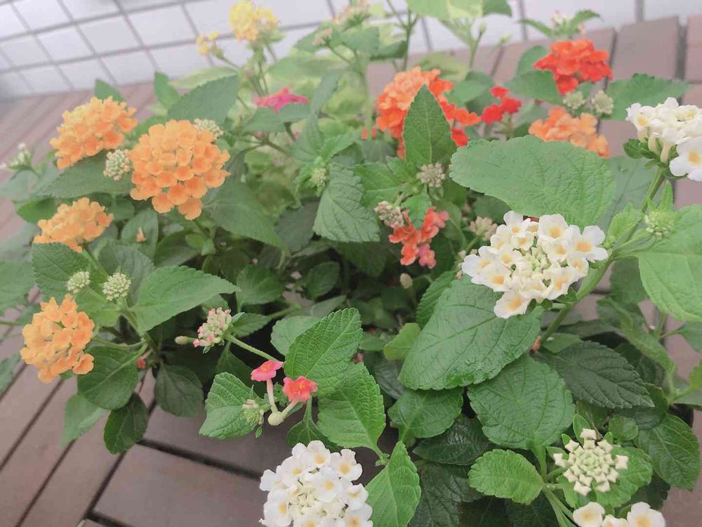 ベランダのランタナ鉢植え🌱かわいい蕾達が次々と顔をだします。ホワイト・黄色・ピンク・オレンジ・赤など明るい小さなお花がまんまるです☺️🧡