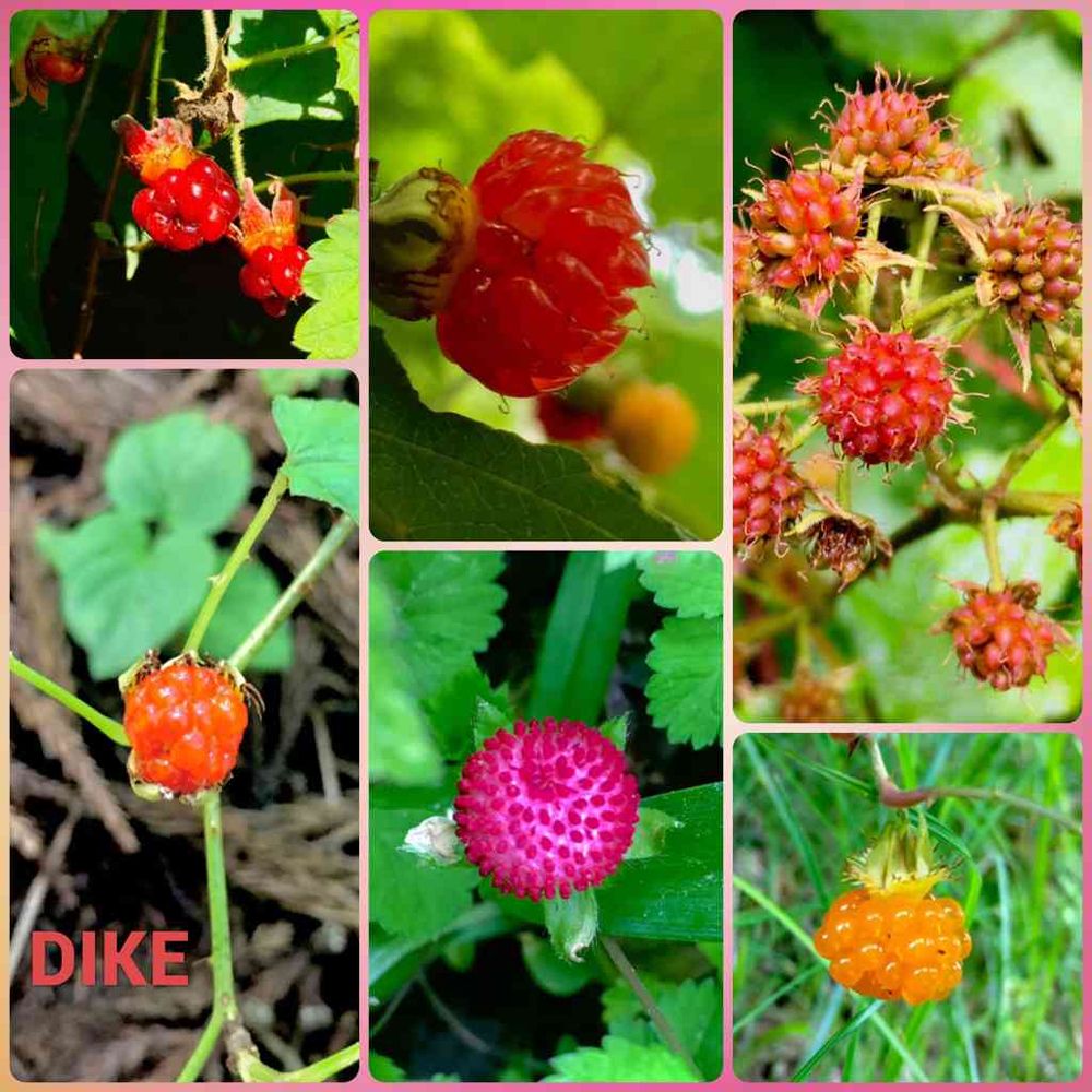 左上より、時計回りに:ナワシロイチゴ、クマイチゴ、クロイチゴ、モミジイチゴ、ヘビイチゴ、ニガイチゴ