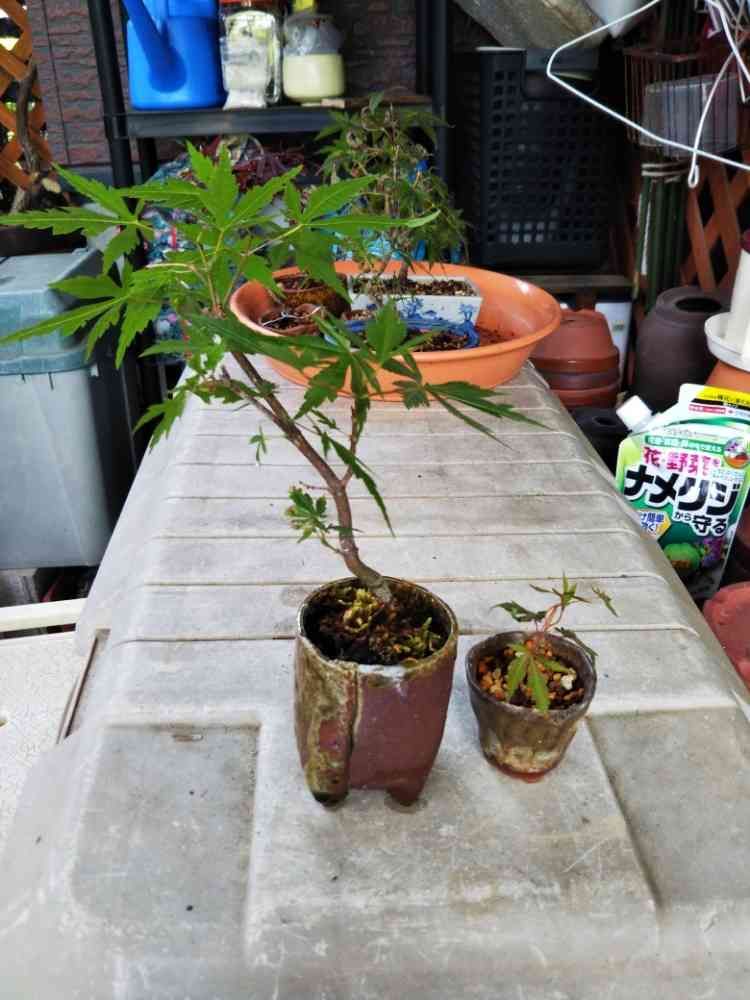 親はたぶん(隣の紅葉)同じと思います。右が弟(妹👧)です😀昨日まで二日間雑草取りしてました。ジャーマンアイリスの葉の下に紅葉出ていて確認したのですが、👴😨実は除草剤撒いてしまいました。直ぐ葉を洗いザルの水苔につかしてました、ラッキーです枯れてなかった見たい、手頃な鉢に植えました。