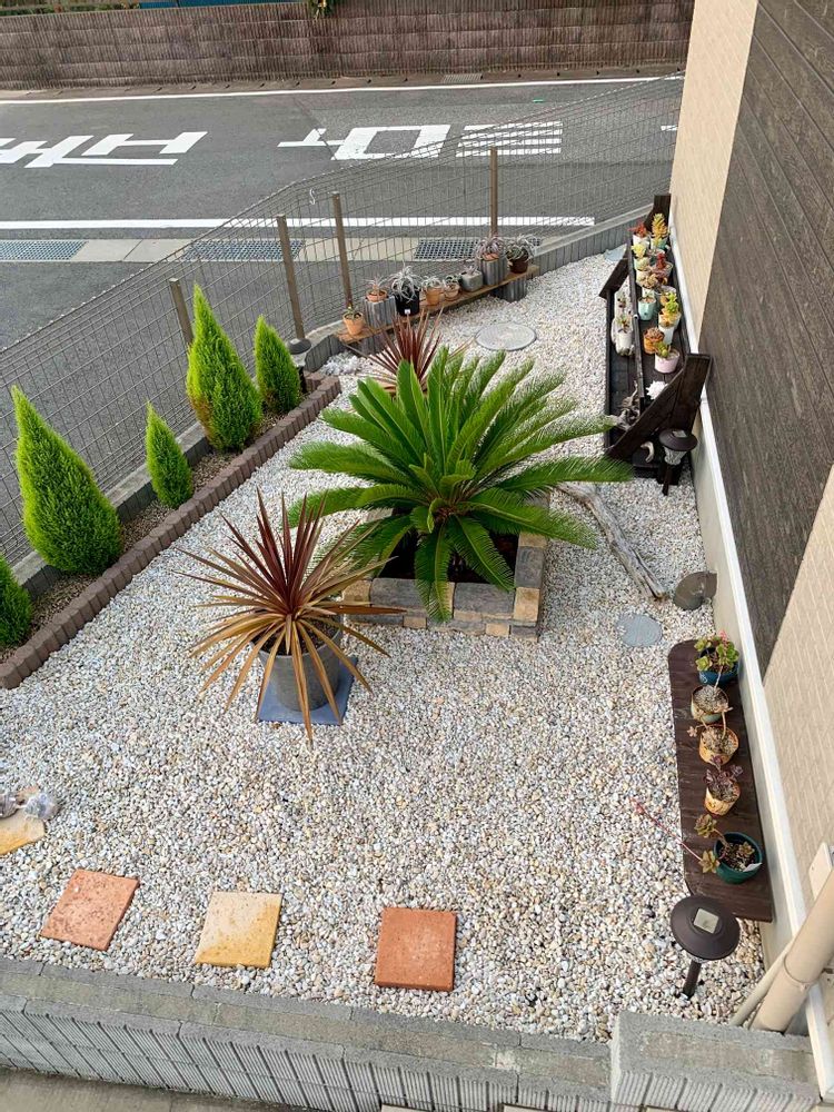 蘇鉄もレンガで花壇つくって、真ん中を防草シートくり抜いて地面を掘り下げて観葉植物専用土を使っているんです😄⭐️
