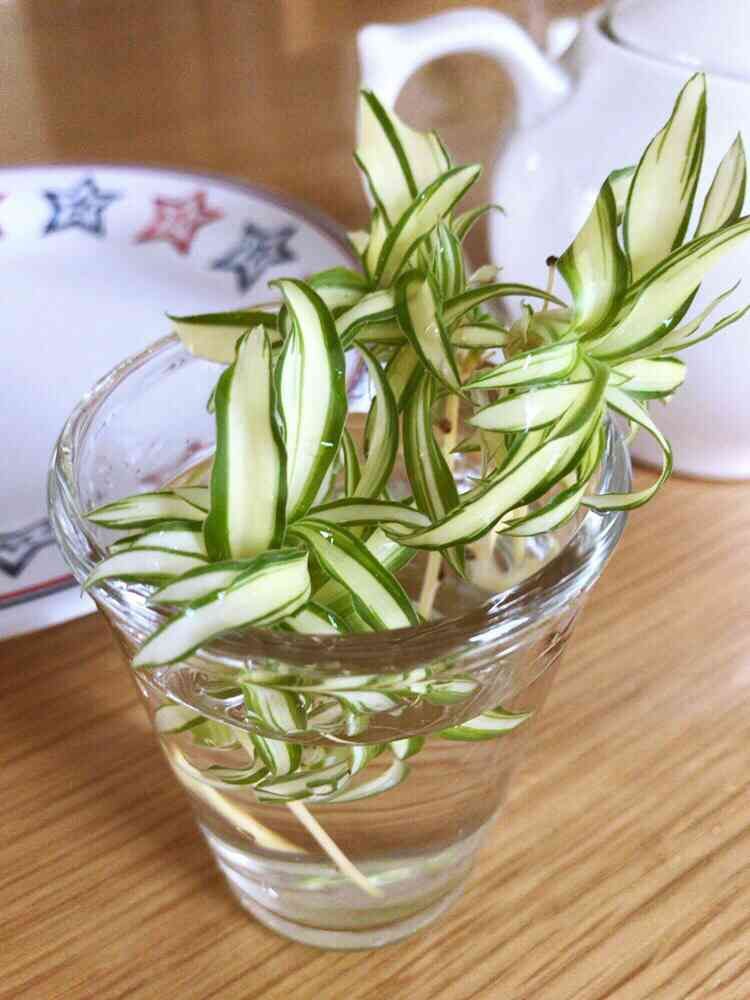 オリヅルランのランナーの先にできた子株を切ってとりあえず水に挿しました。ここから根が出て増やせるとのことですが初めてのチャレンジでうまくいくかな😮
