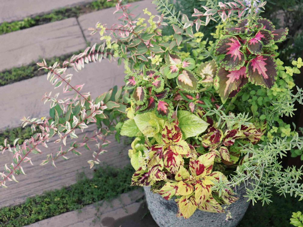 コリウスを中心としたグリーンの寄せ植え☘