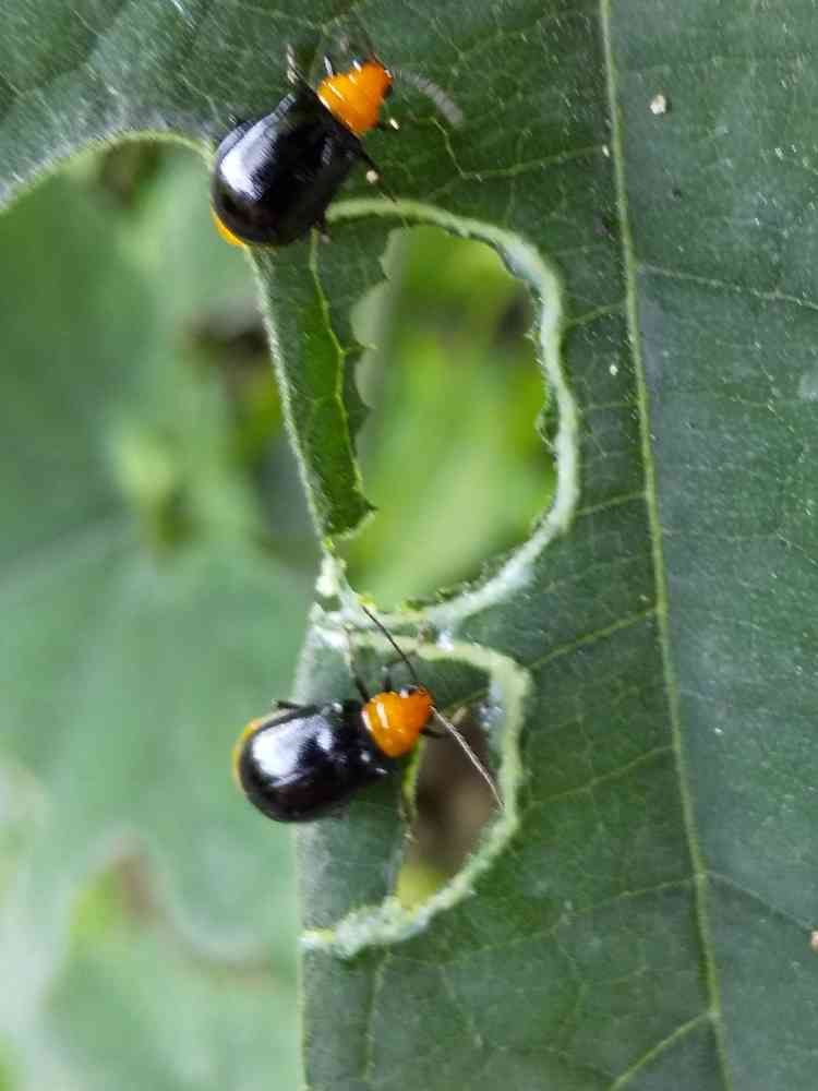 カラスウリの葉を食べるクロウリハムシ