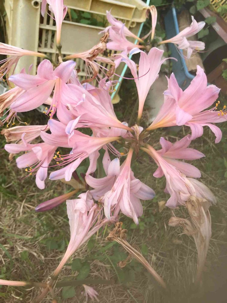 ちょっと枯れかけていますが3日くらい前から綺麗なピンクの花をつけていて アガパンサスにピンクあったかな?ヒゲがあれば彼岸花っぽいのですが。