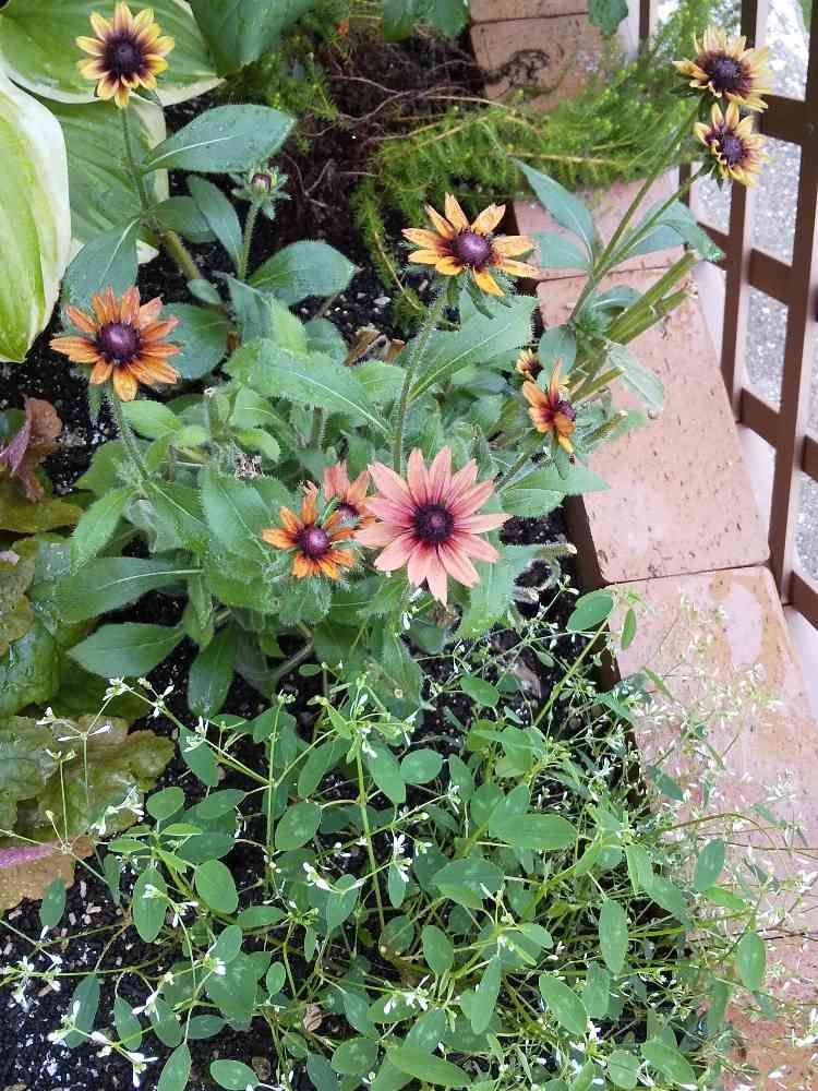 ルドベキアの奥はエリカホワイトデライトですが、梅雨時に蒸れてしまいました💦