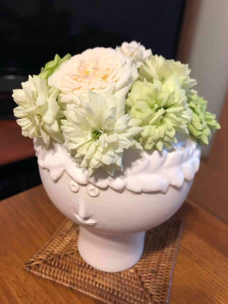 グリーンアイスさんと小さな小さなクラリスさん飾ってみた。このシュールな花瓶にぴったり。