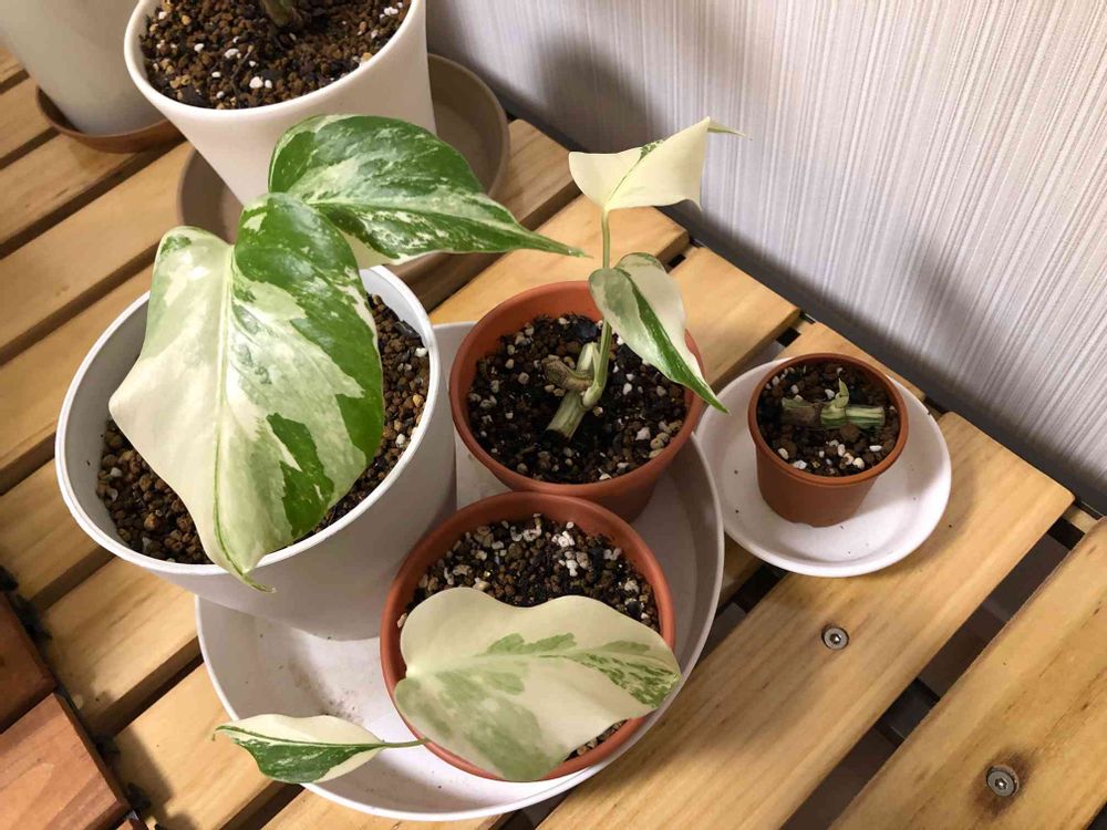 その後→発根が確認出来た時点(2ヶ月ほど)で、オトナのモンステラ達と同じ配合の土(赤玉土7:腐葉土2:パーライト&バーミキュライト1+観葉植物培養土を少々)に植え替えました☺️🌿❣️