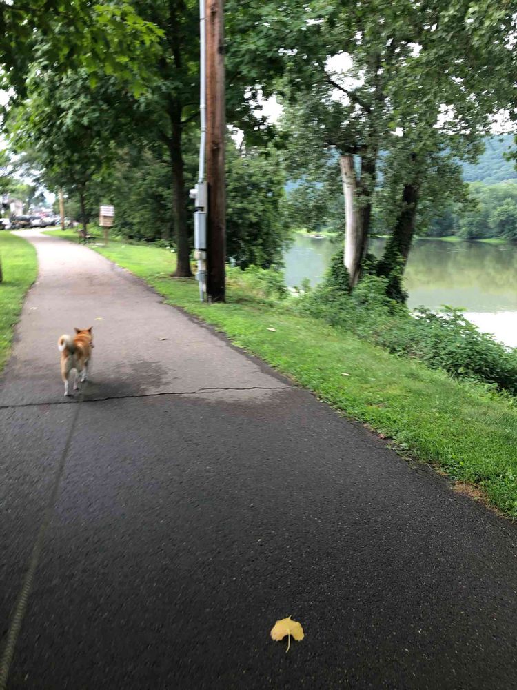久々に町の横を流れる大きなサスケハナ川沿いを散歩、、、でもマーキングで空になったらサスケはもう帰るって、ほんとお散歩好きじゃない珍しい柴犬。雨の後なので水位が上がってた。落ち葉?
