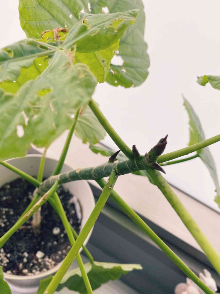 小鳥に沢山、葉を食べられて、キッチンからベランダに避難させたウンベラータ😊新しい芽が出て来てる♥️良かった〜😆