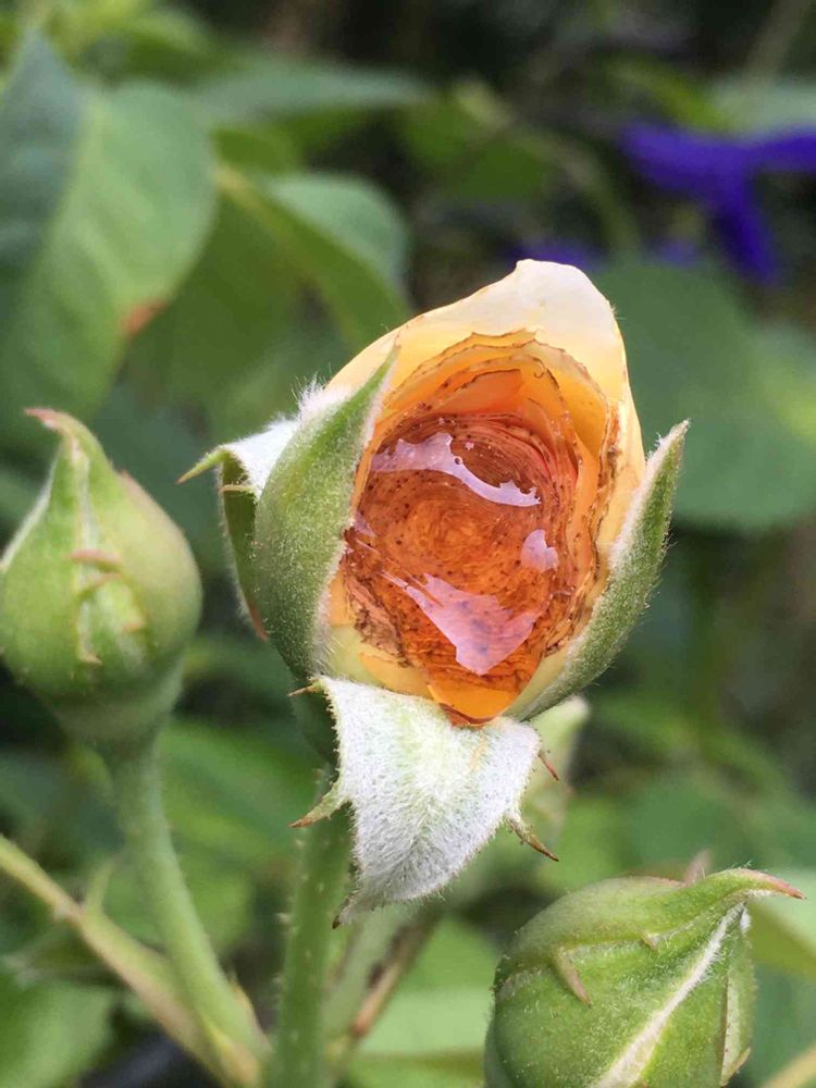 スィートジュリエットの蕾からトパーズ色の蜜がウルウルと光っていた
