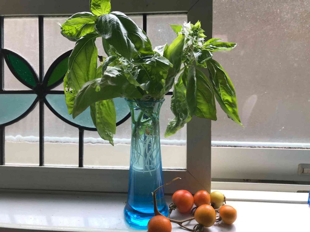 ご近所さんから頂いたバジルから、白い根が。ミニトマトは誘引の際に折ってしまい、キッチンの窓際において中から赤くしました😹