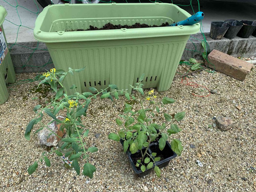 ダメになった小玉すいかの後のプランターに土や肥料を混ぜ直し、花が咲いてしまったミニトマトの脇芽を植えました🍅