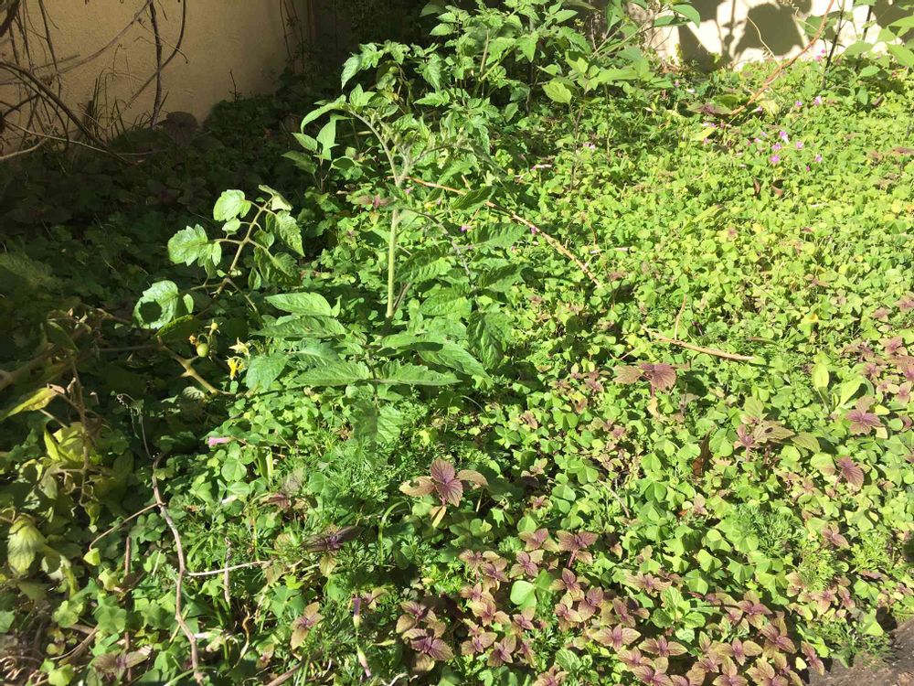 2年目の紫蘇と植えてないトマトがかたばみの海で育ってます(笑)