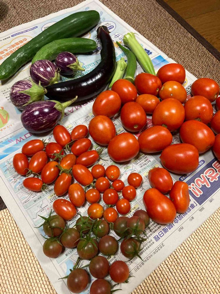 本日の収穫。トマトは調理用とミニトマトのみ、きゅうりやナスもひと休みです。