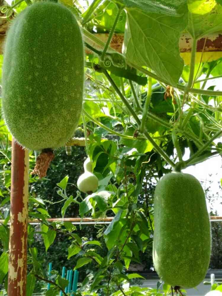 冬瓜もぶどう棚に同居しております。ネットで吊るしてやらないとツルが可愛そうです。