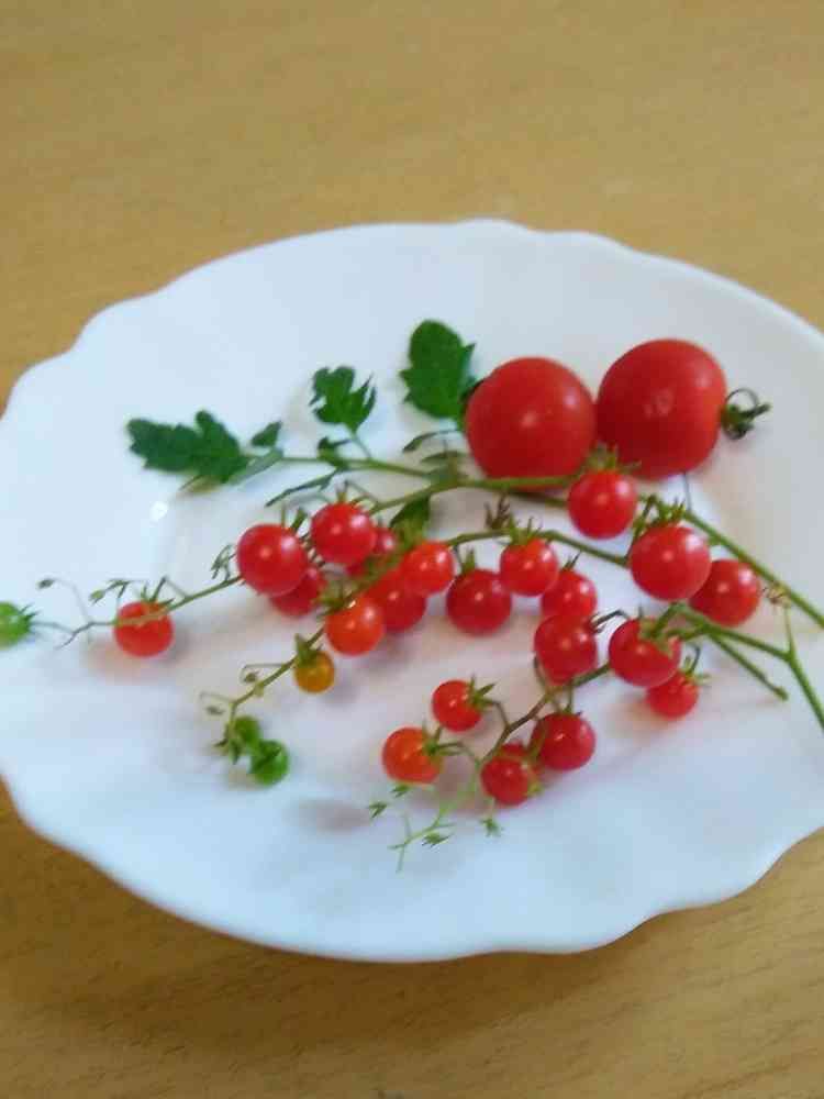 マイクロトマトの実がやっと熟しました。ミニトマトが大きくみえます。