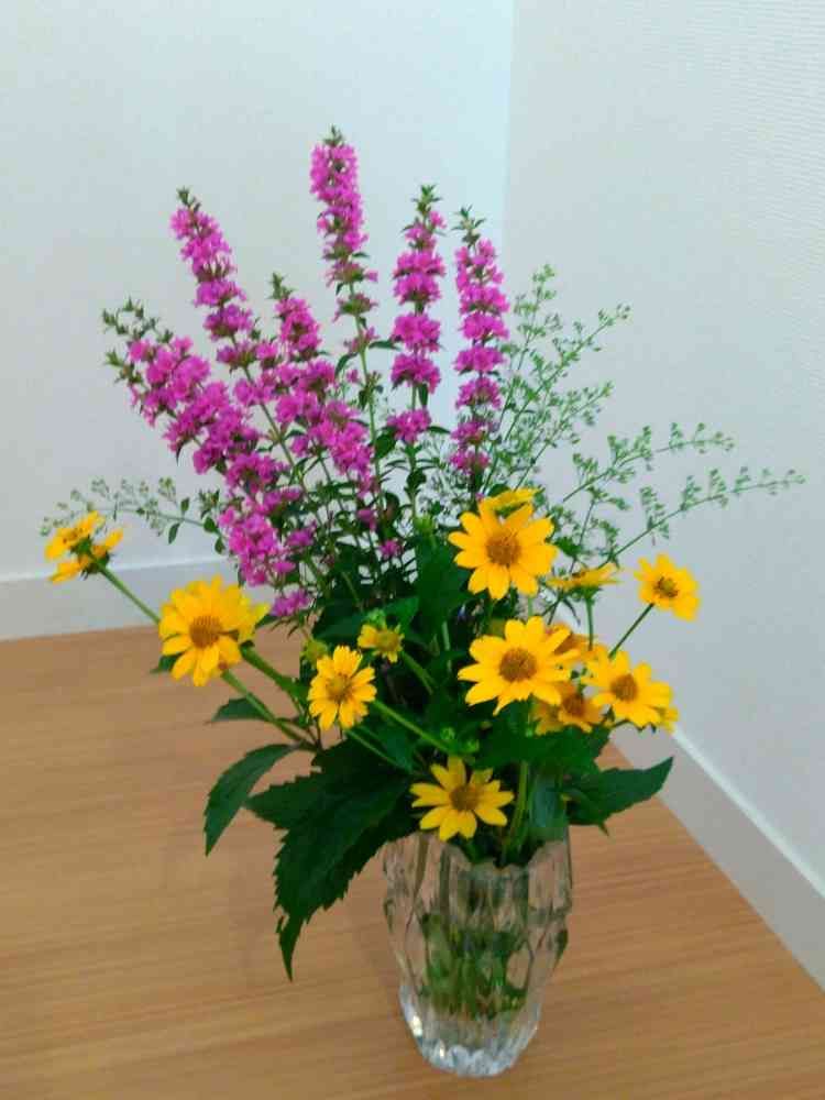 伸びすぎた花たちを切り戻し花瓶に飾ってみました。今年は長雨のせいか どの花も背高のっぽになり 低い花は日当りが悪くなって花が咲きません。 この3種は強い!!