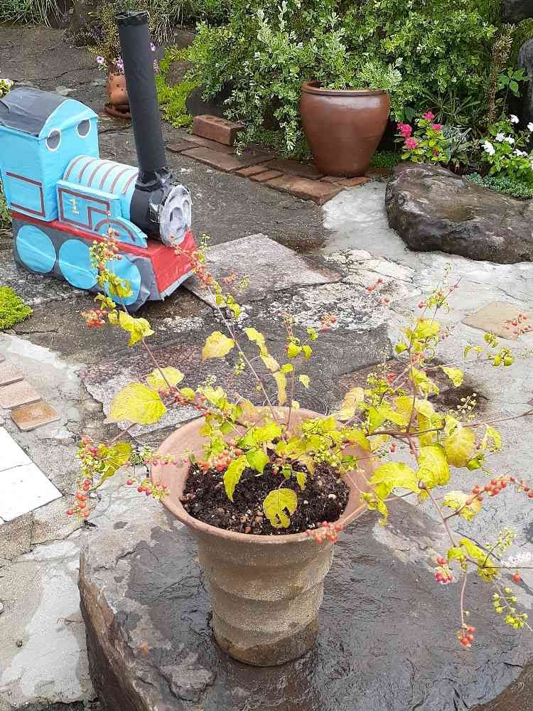 葉が黄色なのは、栄養不足なのでしょうか⁉️後ろには、5年前作ったヨレヨレトーマス。段ボール仕立てで、キャスター付き。25㎏までなら、十分乗れます。