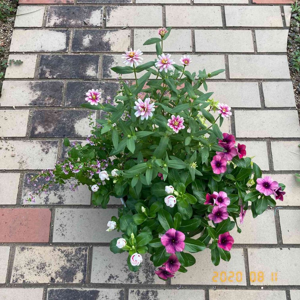 ピンク、紫系の、好きな花だけの寄せ植え。