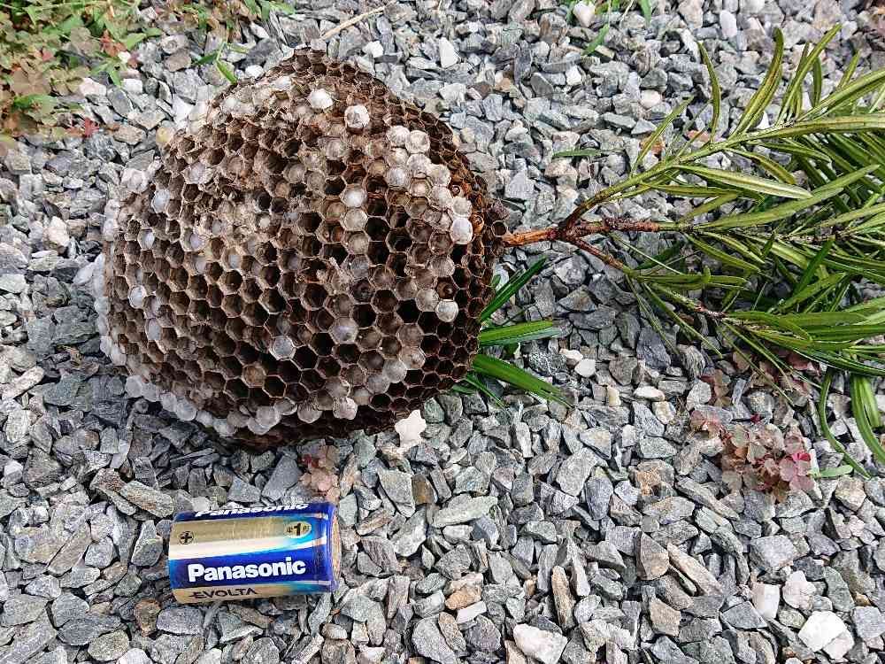 羅漢マキに掛かってたアシナガバチの巣の撤去17㎝Ⅹ15㎝今迄で最大のサイズでした。😅