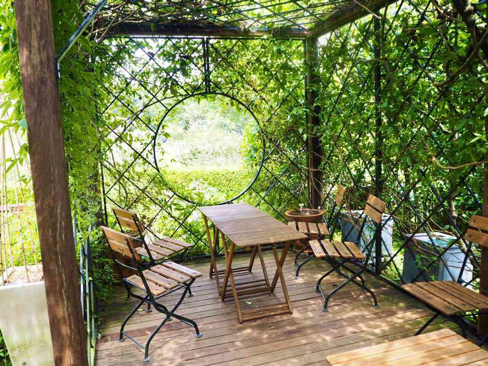 5月頃だったらここにバラもクレマチスも咲いててすっごく素敵なんだよ