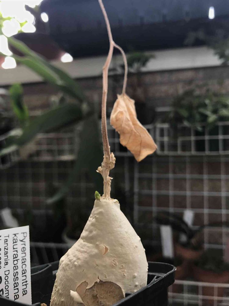 日光に当てて鉢を温めといたら白い薄皮でわかりにくいですけど、塊根の上の方が少しだけポコっとなってくるんで、そこから芽が出てくると思いますよ〜!