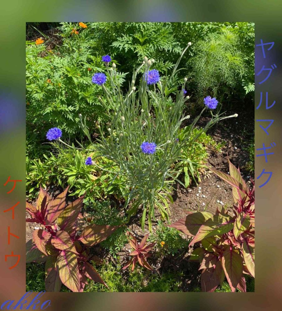 青い矢車菊も、春咲いた花からの種が溢れて咲いてます