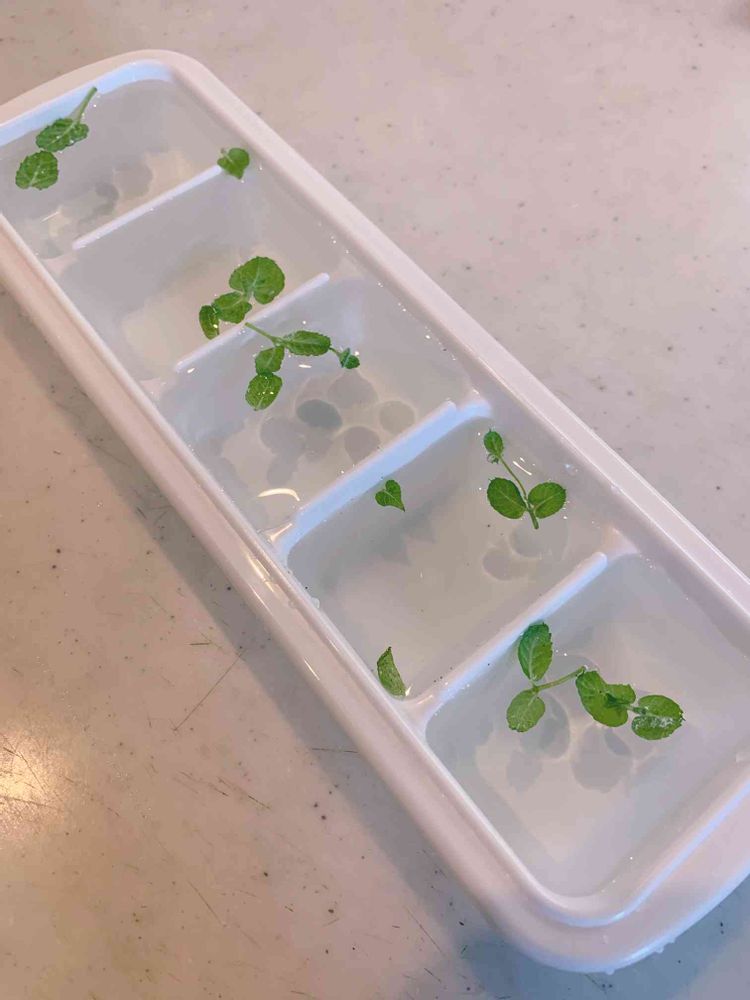 これはミント🌱を浮かべただけですが、製氷皿に水を半分入れて、ミントの葉を投入。固まったら水を満タン🈵に入れれば良いことに今、気づきました(笑)