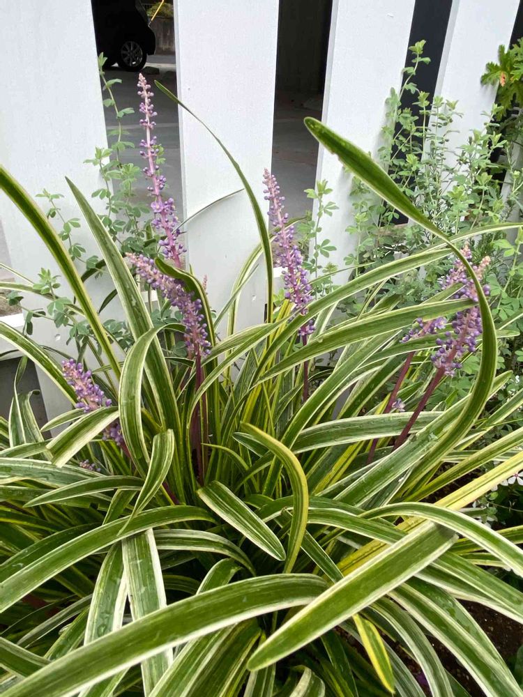 花壇に合わないかも?って植えててのですが、一年中葉が枯れないので、抜かないでいたら夏の今頃、紫色の細長い花が伸びてきて咲くのが楽しみになっています。