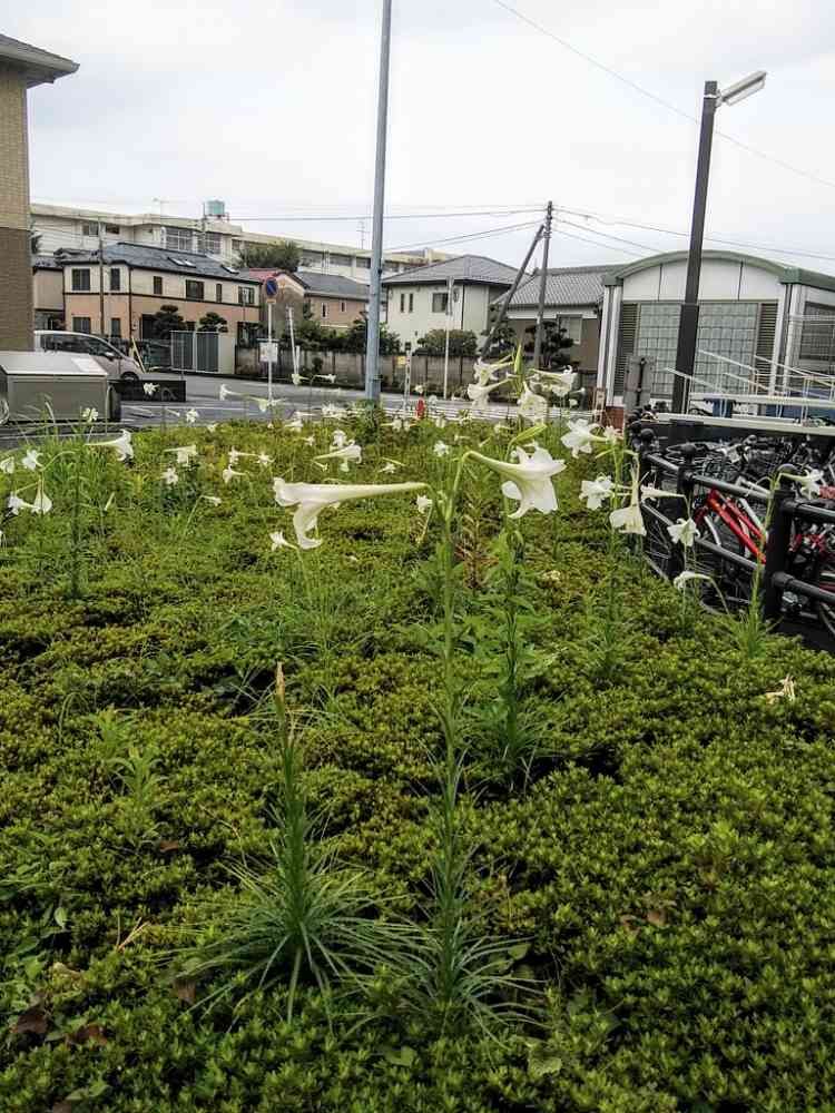 ツツジの植え込みに、新テッポウユリが咲いてるよ。
