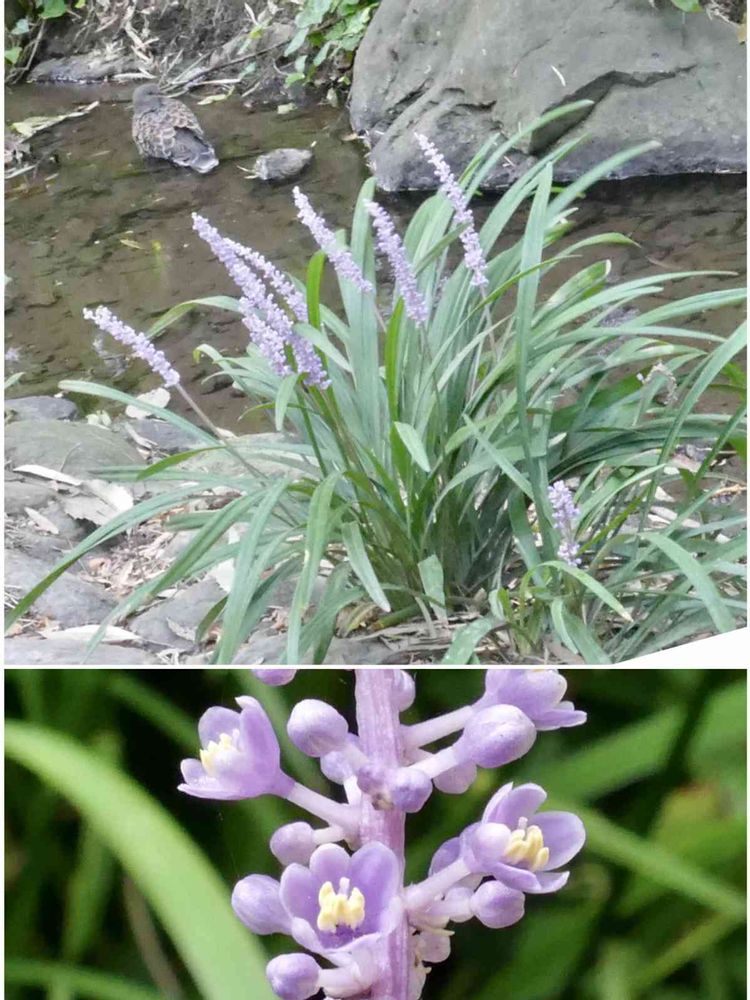 今日のお花「ヤブラン(藪蘭)」が咲く遊歩道の小川は、鳩の避暑地になっていました🐦🏝🌿🌴