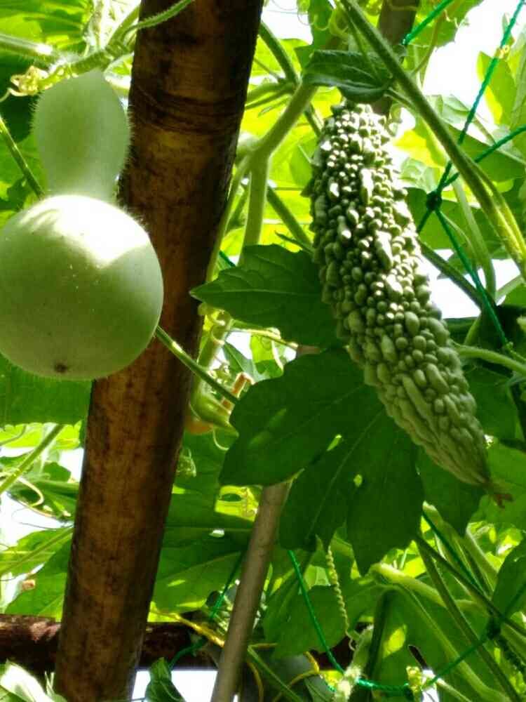 ブドウ棚に同居の、ひょうたんとゴ−ヤ