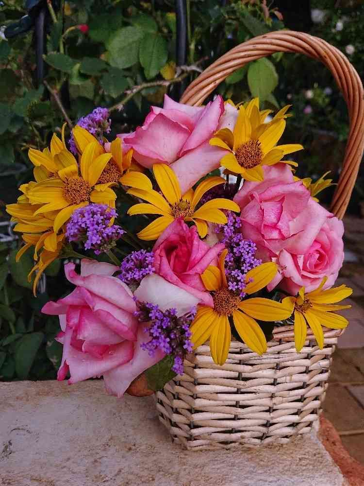 ウエディングベルズ、小さく咲いたオーガスティヌ アレム、三尺バーベナ、色が寂しかったので黄色いの(忘れる~😆)