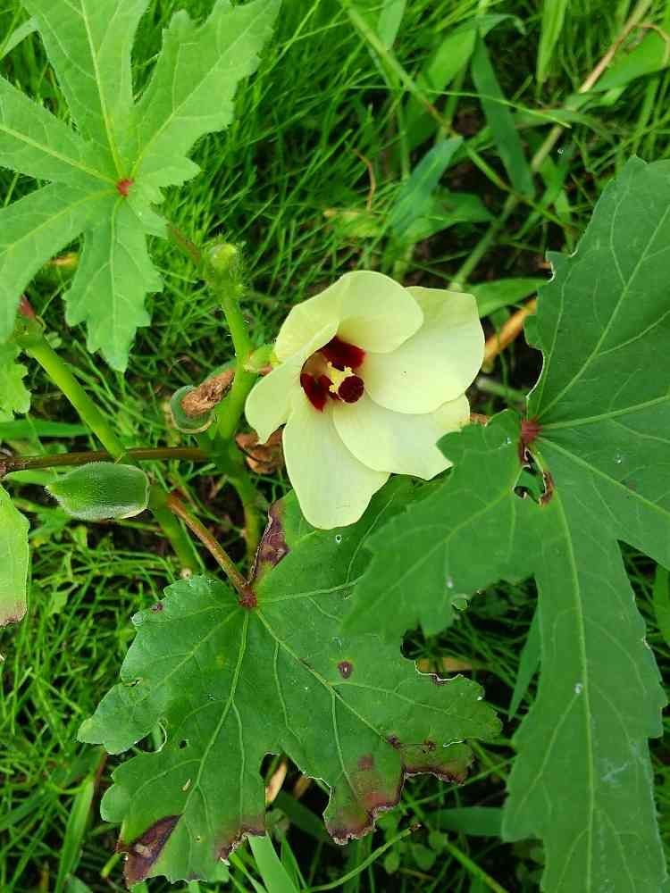 畑に植えたオクラの種から 初めて芽が出て 花が咲きました 思った以上にキレイ❤️