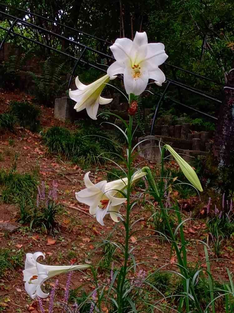 テッポウユリに似ているが、葉が細く、花期が遅い。