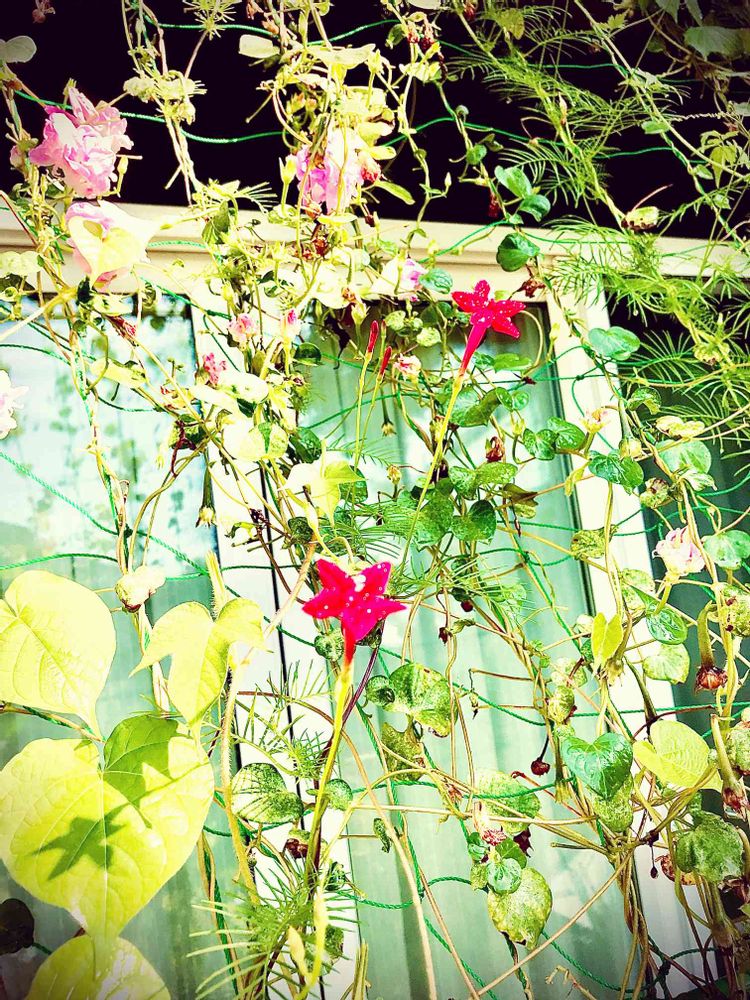 緑のカーテンに赤色と白色のルコウソウが咲き始めました😆🎶⤴️吊る植物の中では成長が早い方?葉っぱの伸びる勢いが凄いですねぇ😆🎶瓦の上まで意地で伸びてます😲